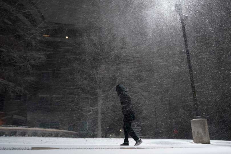 A woman walks through falling snow in San Antonio, Sunday, Feb. 14, 2021. Snow and ice blanketed large swaths of the U.S. on Sunday, prompting canceled flights, making driving perilous and reaching into areas as far south as Texas’ Gulf Coast, where snow and sleet were expected overnight. (AP Photo/Eric Gay)